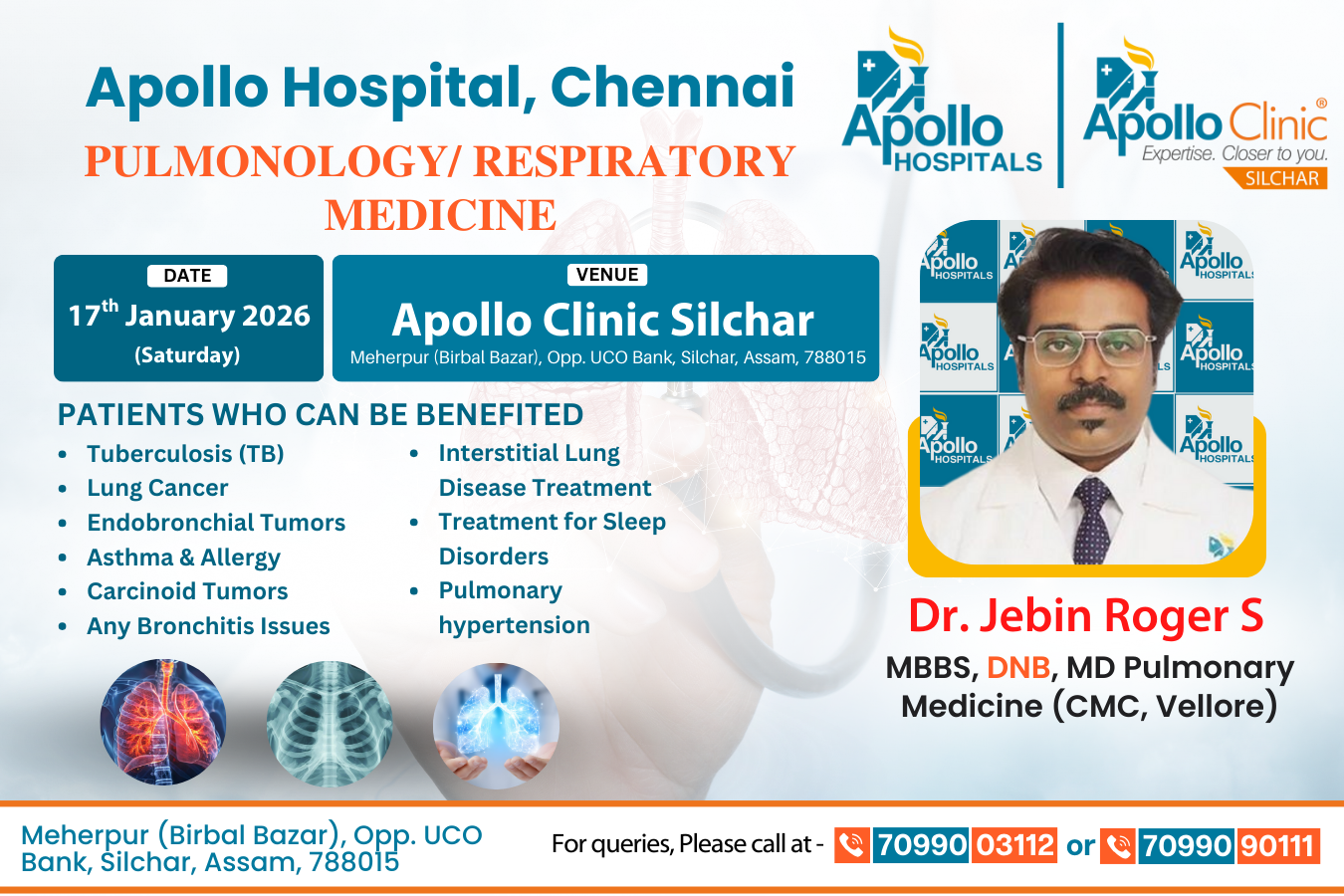 Renowned pulmonologist Dr. Jebin Roger S from Apollo Hospitals, Chennai is once again visiting Apollo Clinic Silchar on 17th January 2026 (Saturday) for specialized consultation on lung and breathing problems. About the visiting pulmonologist Dr. Jebin Roger S is a senior Consultant Pulmonologist with qualifications MBBS, MD Pulmonary Medicine (CMC Vellore), DNB (Pulmonary Medicine) and Diploma […]