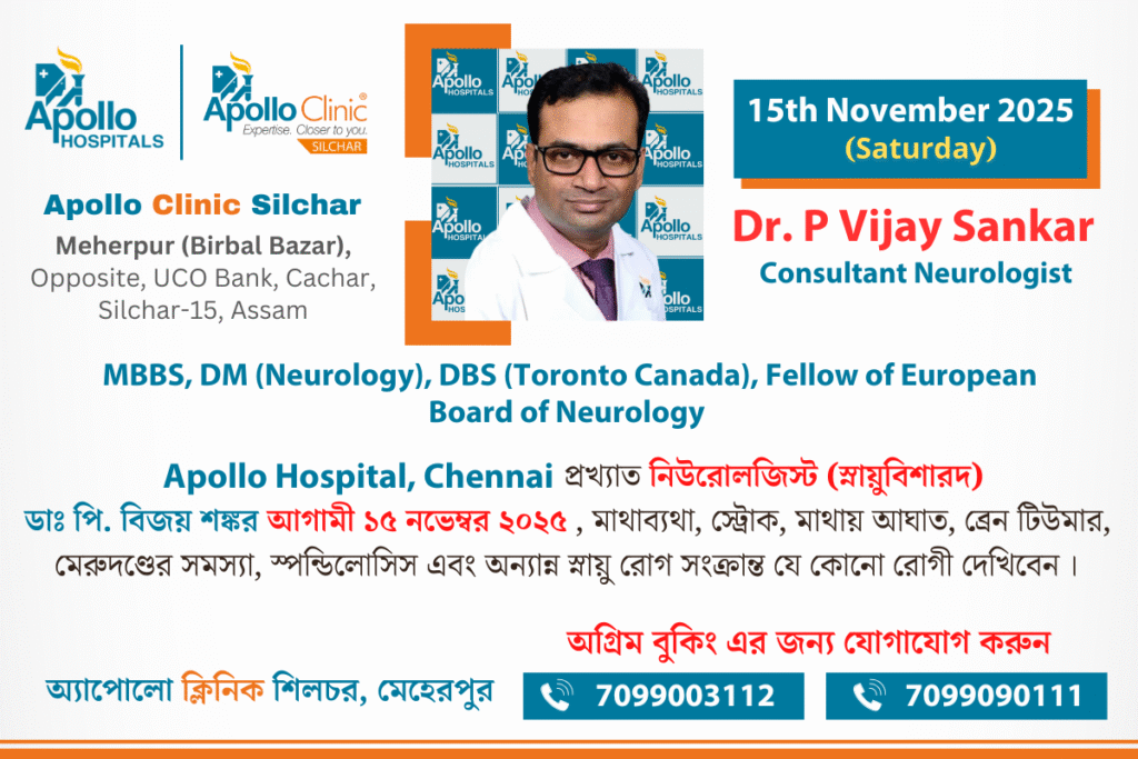 Dr. P Vijay Shankar, internationally acclaimed neurologist, will be visiting Apollo Clinic Silchar on November 15th, 2025, to provide much-needed neurology consultations for the people of Silchar and the greater Barak Valley region. Patients seeking expert care for neurological issues now have a remarkable opportunity to consult one of the leading minds in neurology, right here in Meherpur, Silchar.
